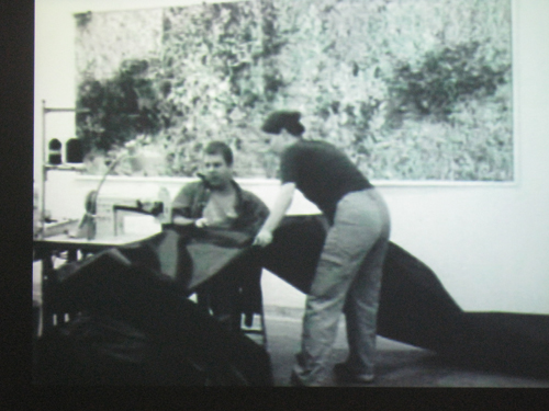 Hauser & Wirth showed a silent film in the basement that documented the making of Jason Rhoades’ Perfect World at Diechtorhallen, Hamburg, 1999. The last picture shows the inexplicable organist, who was rocking out in a haz mat suit in the same room where the aluminum scaffolding tubes were being polished.