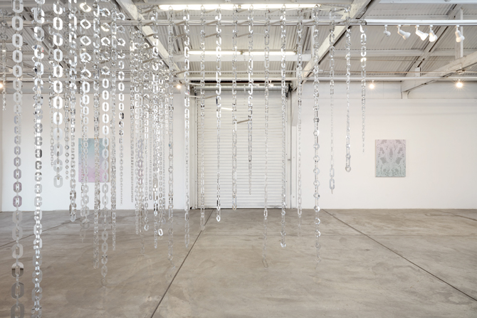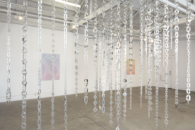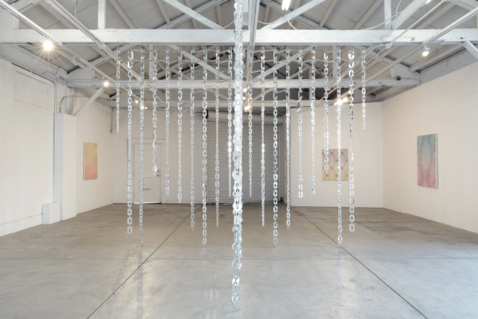 At the center of the exhibition is an architectural installation composed of thousands of individually cut pieces of mirror woven into lace. Suspended from the gallery's rafter and beam structure, the work echoes its environment in an ever-shifting choreography.