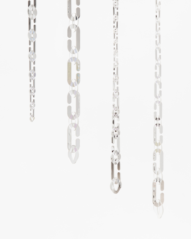 Echo’s Loom references historical forms of lace-making, including punto de aria, a form of 17th century geometric lace so delicate and insubstantial that it translates to stitches in the air. Here the structure of lace is simplified to a binary—alternating hooks and loops. Instead of traditional lace patterns, the work’s dangling strands of reflective hooks and loops rhythmically increase and decrease in both size and complexity, algorithmically encoding waves.