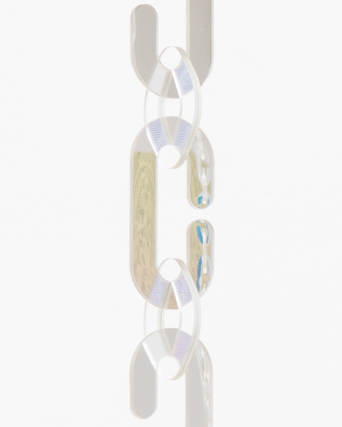 A new series of paintings accompany the installation, and are reflected and activated by it. Each is composed of a combination of historical lace patterns, AI generated lace, and algorithmic ASCII image-to-text processing. Delicate waves of mesh lace sfloat above a gradient ground, as if to both conceal and reveal screens of shifting color.